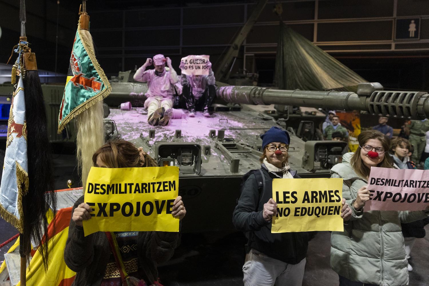 ‘Palyaço birliği’, söz konusu Expojove fuarında, bu yıl mevcut belediye ekibinin izniyle genişletilen ve Centauro askeri muharebe aracının sergilendiği Valencia Askeri Komutanlığı standına gitti. Festivaller ve Gelenekler Meclisi Üyesi Mónica Gil’in liderliğindeki belediye heyeti, Silahlı Kuvvetlere desteğini göstermek için yaklaştığında, birkaç ‘palyaço’ savaş aracına bindi ve pembe boya kutuları dökerek, “Dua ettiler” pankartları taşıdılar. Aktivistlerin geri kalanı belediye yürüyüşünün etrafında “Savaş şaka değildir” ve “Desmilitaritzem Expojove” gibi daha fazla poster sergiledi.