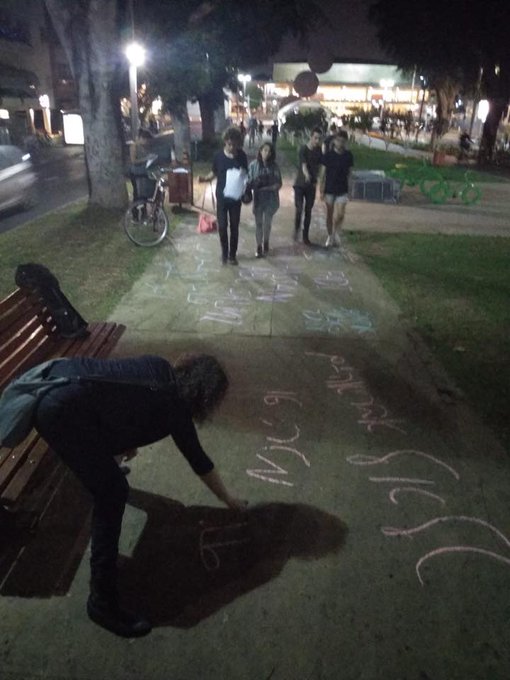 Bir grup eylemci de Tel-Aviv merkezine, İsrail’in gerçekleştirdiği saldırıda hayatını kaybedenlerin isimlerini caddelere yazdı.