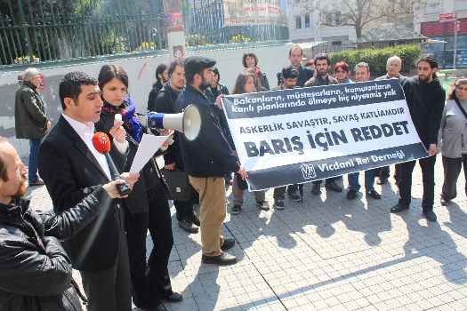 Vicdani Ret Derneği, bugün Galatasaray’da gerçekleştirdiği bir eylemle, Suriye ile savaş senaryolarının konuşulduğu toplantı hakkındaki görüşlerini aktardı ve “Kapalı kapılar ardındaki toplantılarda, devlet yetkililerince yazılan senaryolarda, planlanan savaşlarda kaybedecek bir yaşamımız yok. Onların bu kirli planlarında ölmeye, öldürmeye, katletmeye hiç niyetimiz yok” dedi ve herkesi başta bu savaş olmak üzere her tür militer kurum içinde yer almayı reddetme çağrısında bulundu.